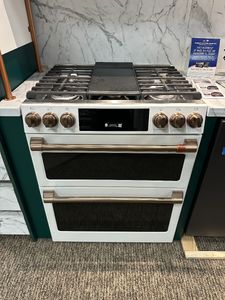 This is a slide-in range for those who love to cook. The industry’s first edge-to-edge cooktop with six versatile burners also includes an integrated griddle to easily handle large meals and family favorites. An integrated temperature probe ensures that meats are prepared to the perfect doneness. And a double oven lets you prepare different foods at different temperatures at the exact same time. THIS ITEM CAME TO US AS AN ASIS PRODUCT. IT HAS BEEN TESTED AND WORKS. IT COMES WITH A 1 YEAR MANUFACTURER'S WARRANTY. UNIT IS ON DISPLAY WITH NO VISIBLE DAMAGE.Read More