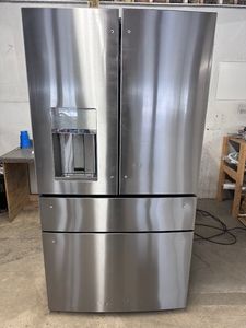 Your style is our substance. Find undeniable style behind every door with 4-door refrigerator from Café. Sophisticated aesthetic details invite you in to experience imaginative features, such as the convertible drawer with a Soft Freeze setting and a Hands-free Autofill dispenser for a refrigeration solution that fits your style. THIS ITEM CAME TO US AS AN ASIS PRODUCT. IT HAS BEEN TESTED AND WORKS. IT COMES WITH A 1 YEAR MANUFACTURER'S WARRANTY. MULTIPLE SCRATCHES AND DENTS ALONG DOORS.Read More