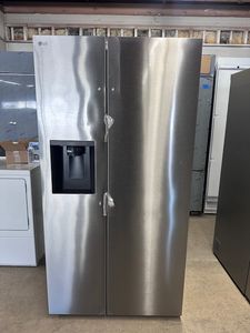 27 cu. ft. Standard-Depth, Side-by-side Refrigerator, with Ice and Water and New Bar Handle Design. Smooth Touch Ice Dispenser. Flat Panel Door Design with Premium Bar Handles. THIS ITEM CAME TO US AS AN ASIS PRODUCT. IT HAS BEEN TESTED AND WORKS. IT COMES WITH A 1 YEAR MANUFACTURER'S WARRANTY. DENTS IN BOTH DOORS AND LITE DENTING IN REAR PANELING.Read More