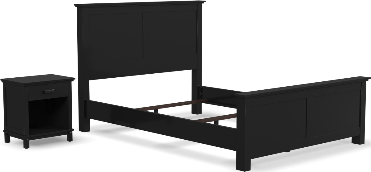 The headboard and footboard feature a timeless double panel design. The nightstand offers a convenient place for all your bedside items, and the added space below is perfect for storing books, tablets, and more. Painted in a classic black finish, this craftsman-style bedroom set will fit right in with existing furniture, or help you create a new look.