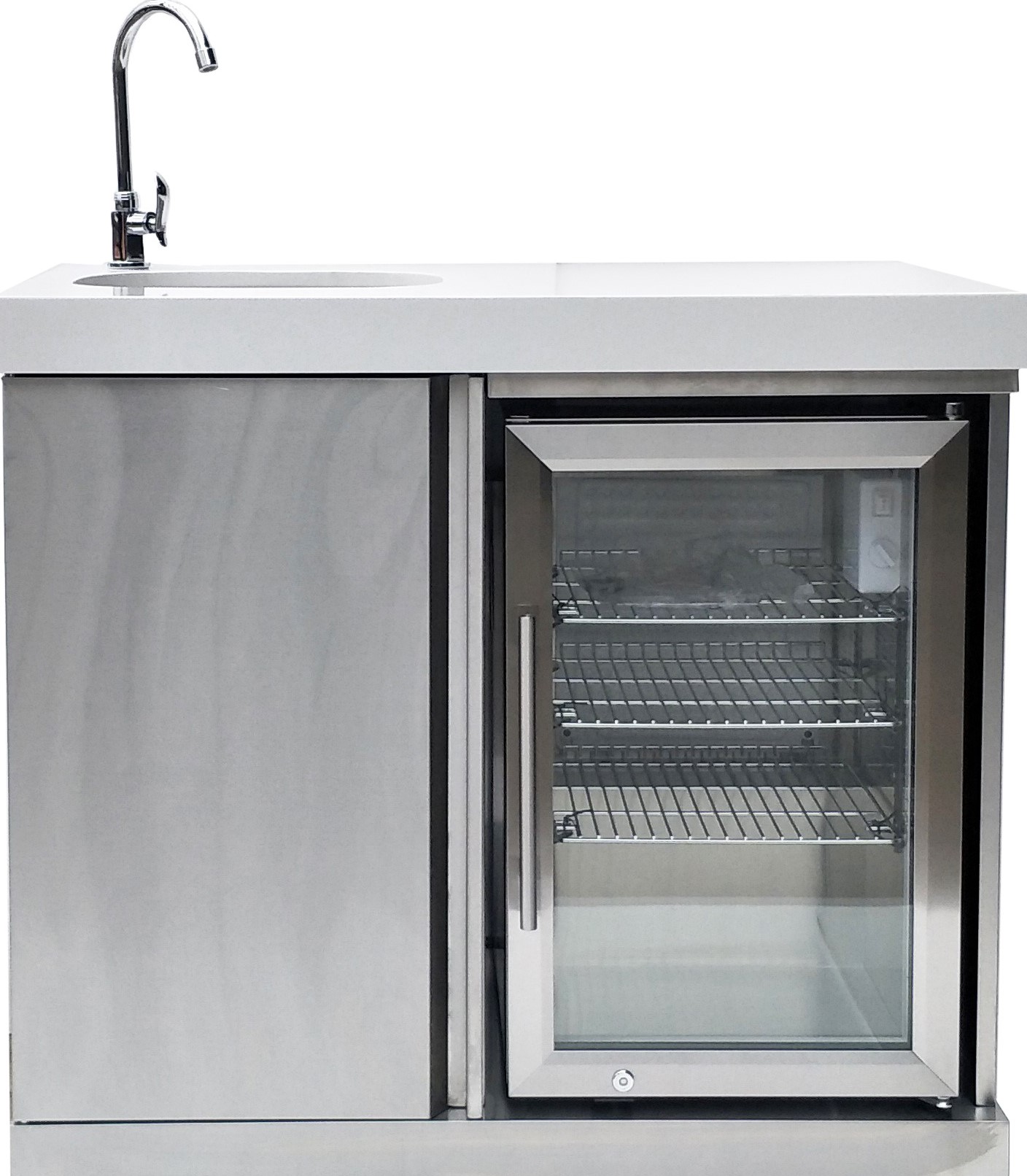 The Mont Alpi Beverage Center finished with white granite counter surface makes a beautiful addition to a Mont Alpi Island grill or as a stand alone beverage center on your patio. It comes standard with an outdoor rated fridge with stylish lights and a sink. Impress you friends and offer them a beverage.Read More
