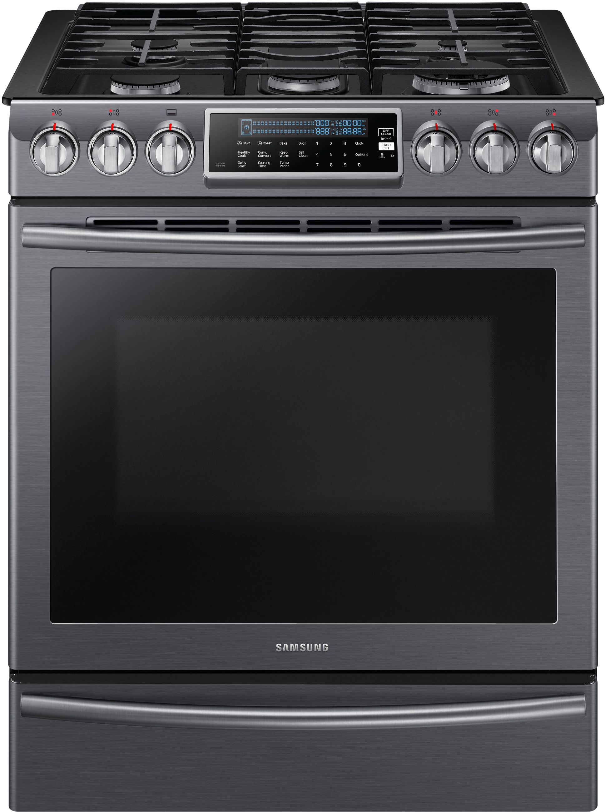 Samsung 30" Slide-In Gas Range-Fingerprint Resistant Black Stainless Steel with 5.8 cu. ft. to upgrade any kitchen with this sleek slide-in gas range. It blends seamlessly with your cabinetry to give your kitchen a high-end look. It offers flexibility for big cooking jobs, from its five-burner cooktop to its large-capacity 5.8 cu. ft. oven. It also features True Convection, for beautifully even cooking that takes less time and uses less energy. al capacity, true convection and warming drawerRead More