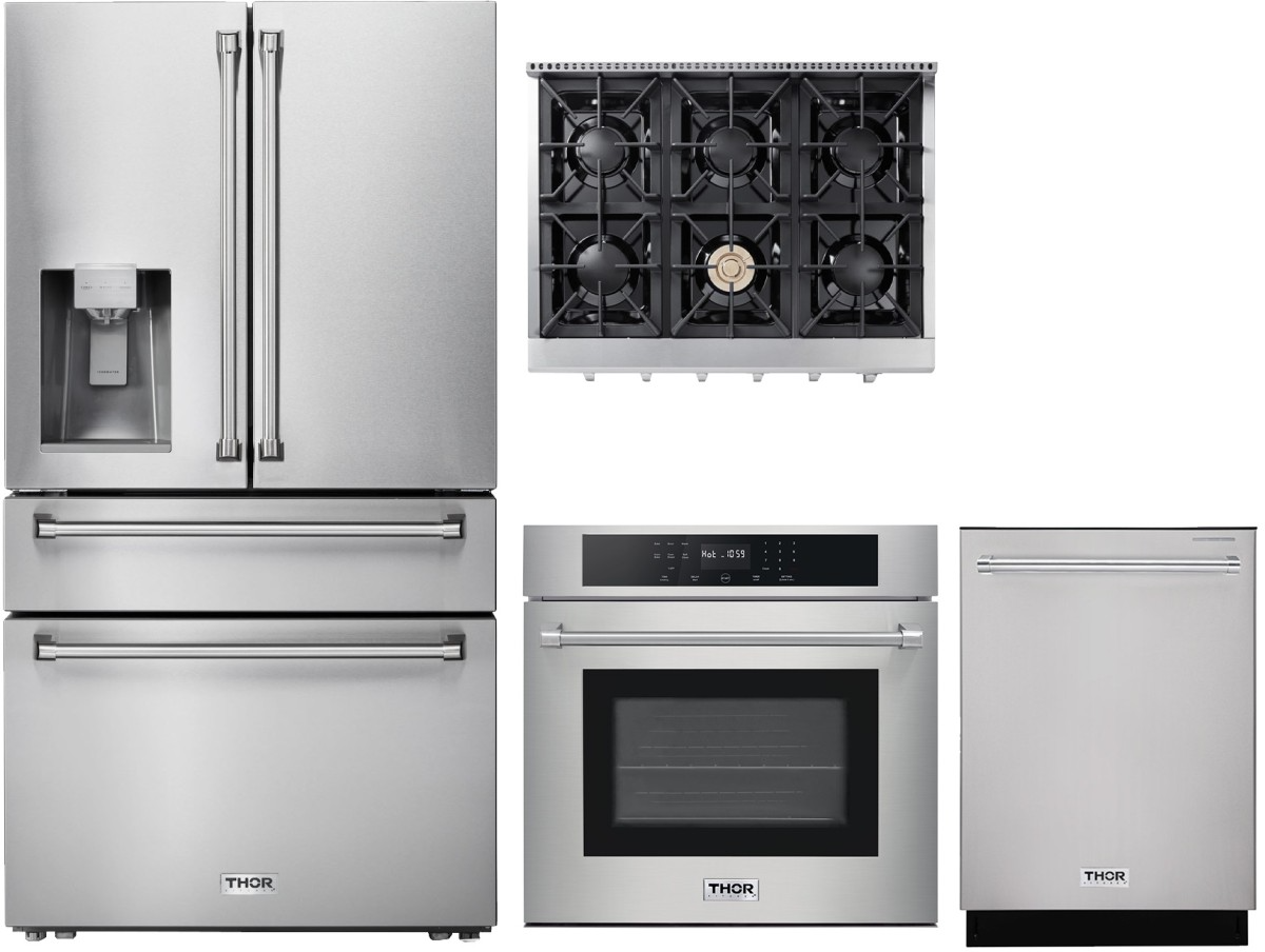 Thor Kitchen® 4 Piece Stainless Steel Kitchen Package with a French door refrigerator, single electric wall oven, gas rangetop and built in dishwasher.Read More
